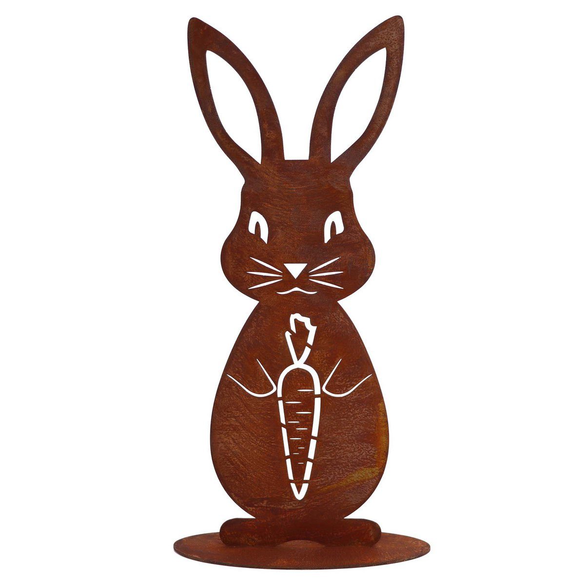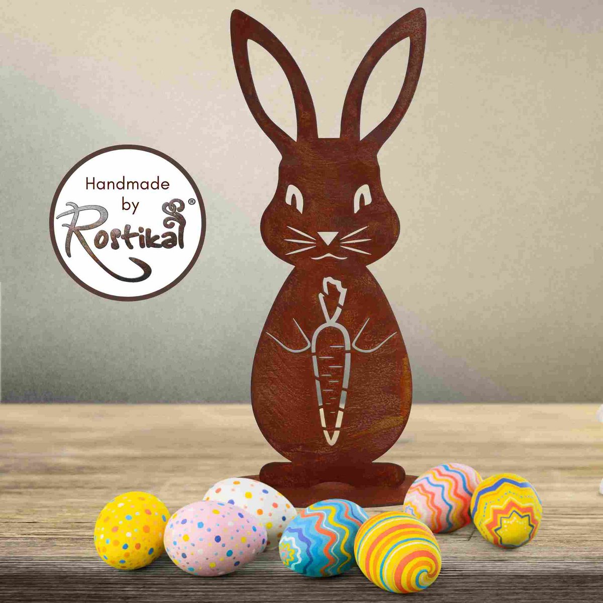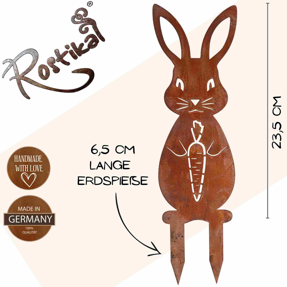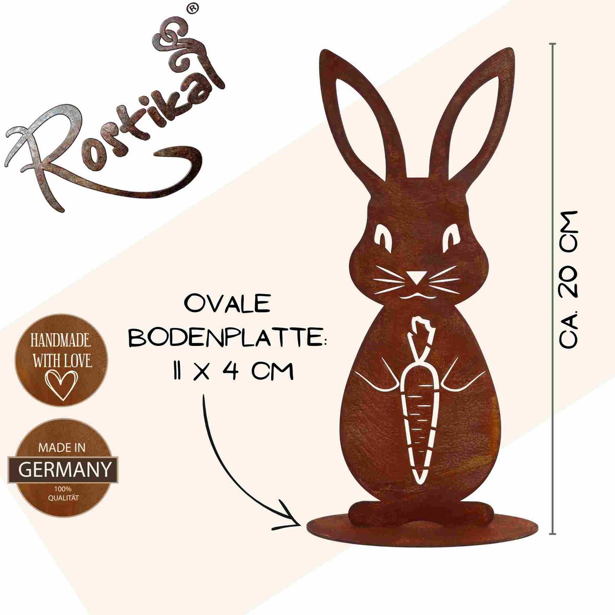 Rostiger Dekohase für den Garten – Ein Highlight für Ihre Osterdeko draußen. Entdecken Sie Karla Karotte, unseren rostigen Dekohasen, die perfekte Ergänzung für Ihre Osterdeko im Garten. Diese charmante Figur vereint die beliebten Trends von Rostdeko und Gartendeko aus Metall in einem einzigartigen Dekorationselement für den Frühling. ➤ Osterdeko Garten: Positionieren Sie Karla Karotte als zentrales Element Ihrer Frühjahrsdeko – zwischen blühenden Blumenbeeten, auf dem saftigen Rasen oder als charmanten Hingucker auf Ihrer Terrasse. Unsere Gartendeko im Edelrost-Design fügt sich harmonisch in jede Umgebung ein und versprüht eine festliche Atmosphäre. ➤ Flexibel & Wetterfest: Karla Karotte ist nicht nur ein Highlight für den Garten, sondern auch ideal als Teil Ihrer Tischdekoration oder als auffälliges Detail auf der Fensterbank. In Kombination mit Ostereiern bereichert sie Ihre Osterdeko-Ideen im Innen- und Außenbereich. Wählen Sie aus drei Varianten aus: 21 cm – auf Bodenplatte: Höhe: ca. 21 cm ✓ Breite: ca. 8 cm ✓ Bodenplatte: 11 cm x 4 cm ✓ 30 cm – auf Bodenplatte: Höhe: ca. 30 cm ✓ Breite: ca. 12 cm ✓ Bodenplatte: 15 cm x 6 cm ✓ zum Stecken: Höhe: 23,5 cm ✓ Breite: ca. 9 cm ✓ Erdspieße: 6,5 cm ✓ Gesamthöhe: 30 cm ✓ Eigenschaften: Jeder unserer Dekohasen, Karla Karotte, ist aus hochwertigem Stahlblech handgefertigt und mit einem speziellen Edelrost-Finish versehen, das ihr einen charakteristischen Vintage-Look verleiht. Diese Gartendeko im Vintage-Stil entwickelt über die Zeit eine natürliche Patina, die sie zum idealen Blickfang in Ihrem Garten macht. Ihre Vorteile: Einzigartige Osterhase Deko: Machen Sie Ihren Garten mit Karla Karotte zum Gesprächsthema. Vielseitige Einsatzmöglichkeiten: Ob als Teil Ihrer Garten Deko oder als stilvolle Ergänzung im Haus, diese Metalldeko-Figur ist vielseitig einsetzbar und langlebig. Handgefertigte Gartendeko Figuren: Jedes Stück ist ein handgefertigtes Unikat aus unserer eigenen Manufaktur in der Oberpfalz, wo Sie uns auch gerne vor Ort besuchen können. Ideal für jede Osterdekoration: Suchen Sie nach inspirierenden Osterdeko-Ideen oder einem besonderen Geschenk? Karla Karotte ist die perfekte Wahl für alle, die nach einer hochwertigen und charmanten Gartendeko-Figur suchen.
