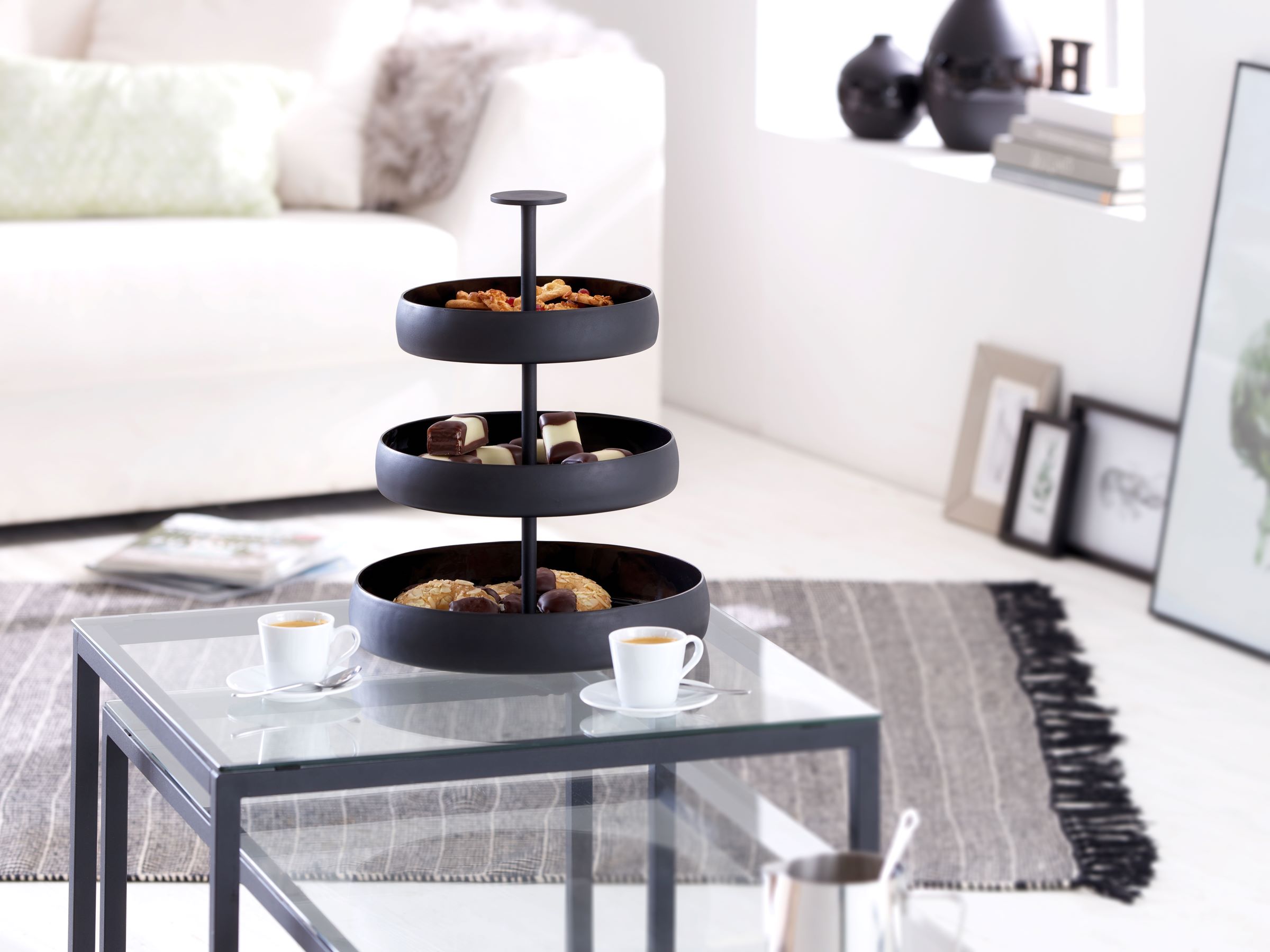 Die gesamte Produktlinie der NEGRETTO-Kollektion verfügt zweifelsfrei über das Potenzial, zu zeitlosen Klassikern zu avancieren. Eine sanft geschwungene, feminin wirkende Formensprache, die das Auge des Betrachters durch ihre außergewöhnliche Zeitlosigkeit nachhaltig erfreut. Die hochwertige Verarbeitung, komplett aus Metall gefertigt, verleiht dem Design eine spürbare Wertigkeit. Im Gegensatz dazu sind die Innenflächen mit einer robusten, hochglänzenden Emaille-Beschichtung versehen, die einen ansprechenden Kontrast zur matten Außenoberfläche bildet. Ob veredelte Oberflächen mit Klavierlack, Wände aus schalungsglattem Beton oder raue Vintage-Holztöne – die dreistöckige Etagere integriert sich harmonisch in jede anspruchsvoll gestaltete Innenraumgestaltung. Die Farbakzente, die durch das Befüllen mit Früchten oder Macarons entstehen, setzen dem NEGRETTO-Design das i-Tüpfelchen auf.