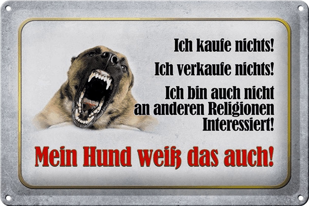 Das Blechschild “Achtung kaufe nichts mein Hund weiß das” in der Größe 20×30 cm bzw. 30×20 cm ist eine dekorative Metalltafel, die sich ideal für Ihr Zuhause eignet. Das gewölbte Design verleiht ihm eine ansprechende Optik und der hervorragende Druck sorgt für ein hochwertiges Erscheinungsbild. Mit abgerundeten Ecken und umgeschlagenen Kanten hat das Schild nicht nur einen ästhetischen Vorteil, sondern auch praktische vorgebohrte Löcher an allen vier Ecken zur einfachen Befestigung.