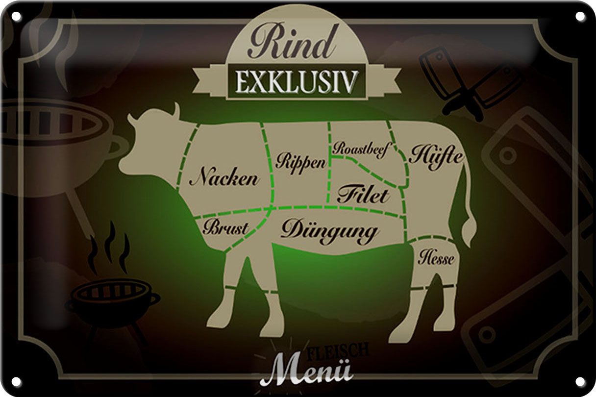 Schild Blech 30x20cm – Made in Germany – Fleisch Schnitte Rind exklusiv Menü Metall Deko Blechschild