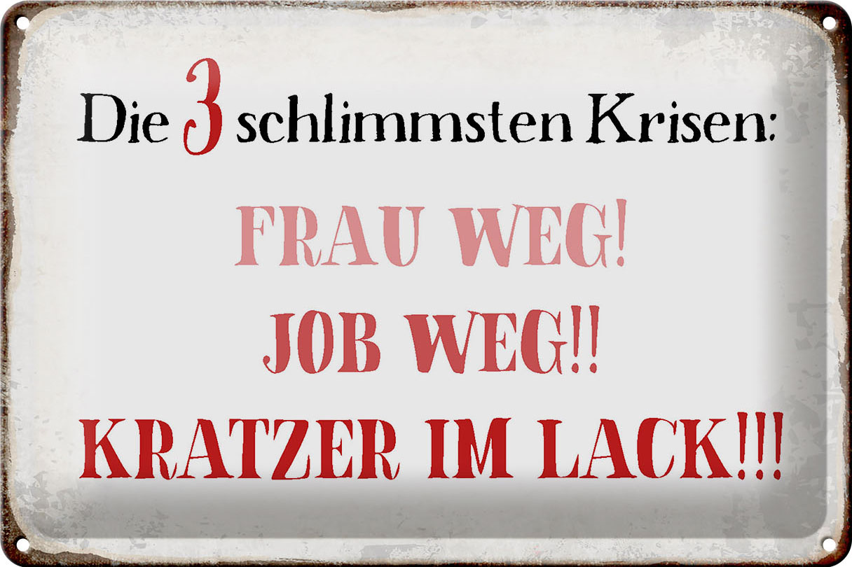 Schild Blech 30x20cm – Made in Germany – Spruch 3 Krisen Frau Job weg Kratzer Metall Deko Blechschild
