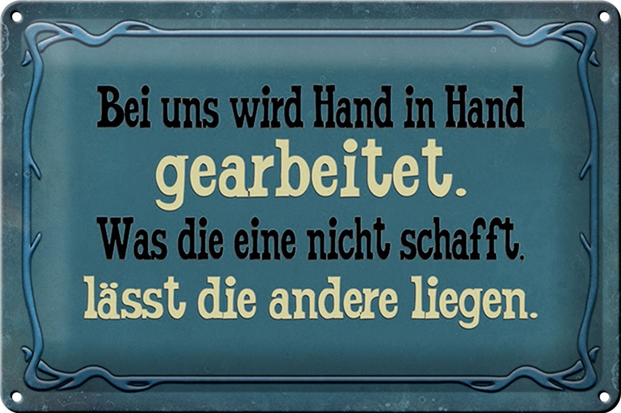 Das Blechschild “Bei uns wird Hand in Hand gearbeitet” n der Größe 20×30 cm bzw. 30×20 cm ist eine dekorative Metalltafel, die sich ideal für Ihr Zuhause eignet. Das gewölbte Design verleiht ihm eine ansprechende Optik und der hervorragende Druck sorgt für ein hochwertiges Erscheinungsbild. Mit abgerundeten Ecken und umgeschlagenen Kanten hat das Schild nicht nur einen ästhetischen Vorteil, sondern auch praktische vorgebohrte Löcher an allen vier Ecken zur einfachen Befestigung.