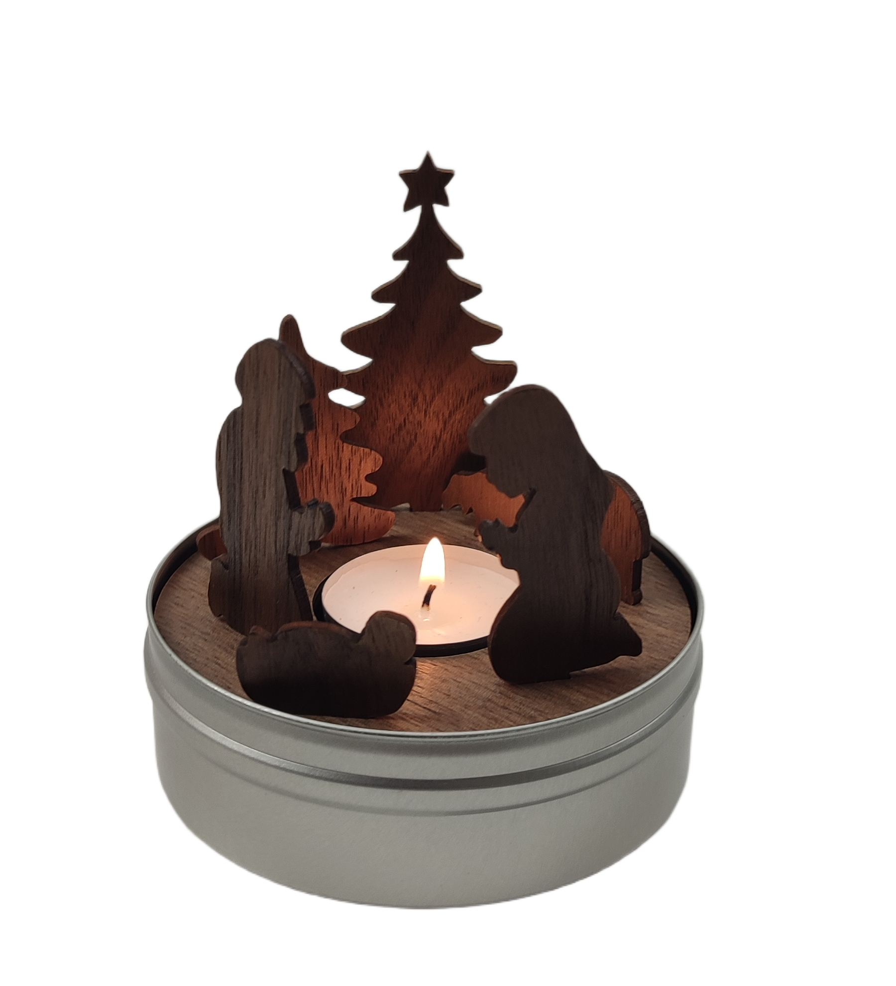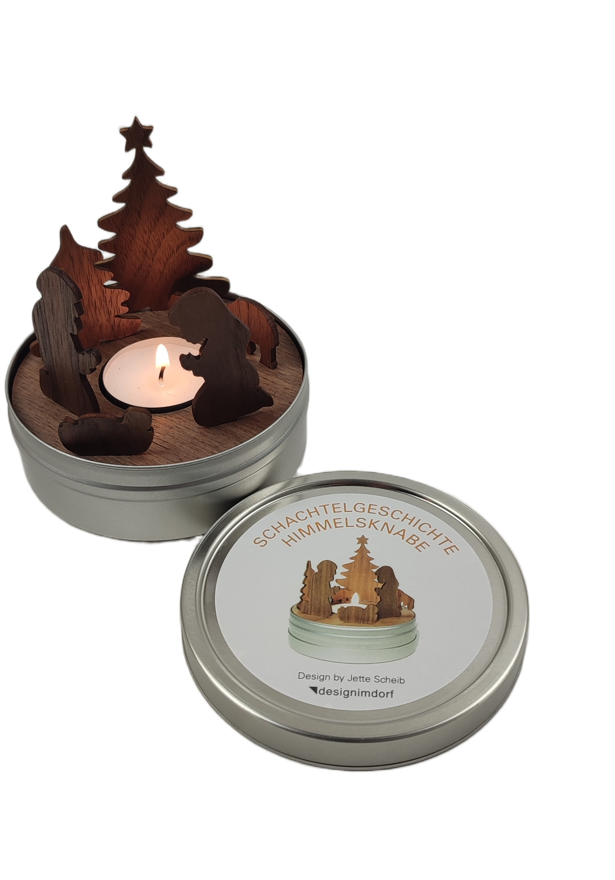 Die SCHACHTELGESCHICHTEN sind perfekt geeignet als liebevolle kleine Geschenke zu Weihnachten. Weder zu umfangreich noch zu schlicht. Die erstklassige Qualität des gelaserten Nussbaumholzes ist dabei sofort sichtbar und fühlbar. Die Motive, ebenfalls aus Nussbaumholz gefertigt, lassen sich auf einer Bodenplatte befestigen. Ein beigefügtes Teelicht erhellt das kleine Bühnenbild, das zusammen mit Anleitung und einer kurzen Geschichte im beiliegenden Booklet in einer Dose verpackt ist.